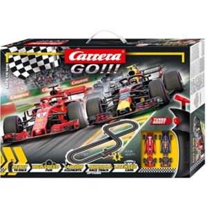 - 2x Carrera GO! ! ! Fahrzeuge im Set enthalten: Ferrari SF71H „S. Vettel, No. 5“ und Red Bull Racing RB14 „M. Verstappen, No. 33“