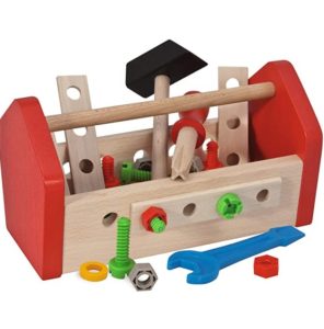 - 30-teiliges Set – im Set ist eine Werkzeugbox aus Holz, Bauelemente, ein Schraubenzieher, ein Schraubenschlüssel, ein Hammer sowie Schrauben und Muttern enthalten. Geeignet für Kinder ab 3 Jahren