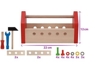 - Praktisch – die 11x22x12cm große Werkzeugbox besitzt einen Griff, so dass sie leicht von den Kindern getragen werden kann. Im Inneren lässt sich das komplette Werkzeug praktisch verstauen