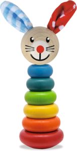 - Eichhorn Steckfigur mit Hasenmotiv – Das süße Stecktier als Hase besteht aus sechs schönen bunten Holzringen in verschiedenen Farben und Größen, die der Reihe nach aufgesteckt werden müssen.