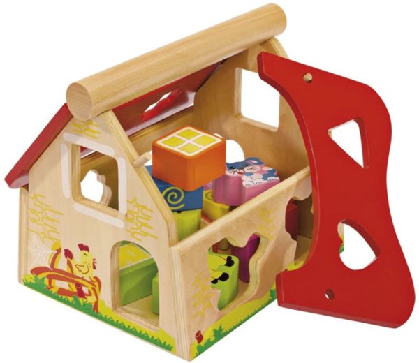 - Steckhaus mit Bausteinen – das 18×17,5x18cm große Holzhaus verfügt über zahlreiche Fenster und Türen in verschiedenen Formen; Die 12 enthaltenen Steckbausteine müssen von den Kindern zugeordnet und jeweils in die richtige Öffnung gesteckt werden
