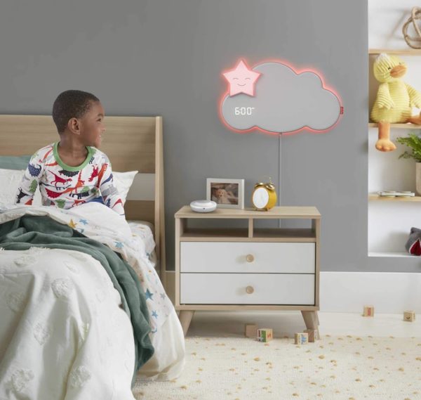 - An der Wand hängend, interaktiver 3-in-1-Routinen-Helfer, Schlaftrainer und Klanggenerator für Kleinkinder. Geeignet für kleine und größere Kinder von 0–8 Jahren. Kein Smartphone enthalten
