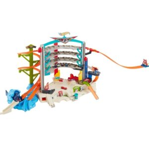 - Enthält Megacity Parkgarage bestehend aus Rampen, zwei Aufzügen, Werkstatt, Zapfsäule, 5 Hot Wheels Autos und einem Helikopter