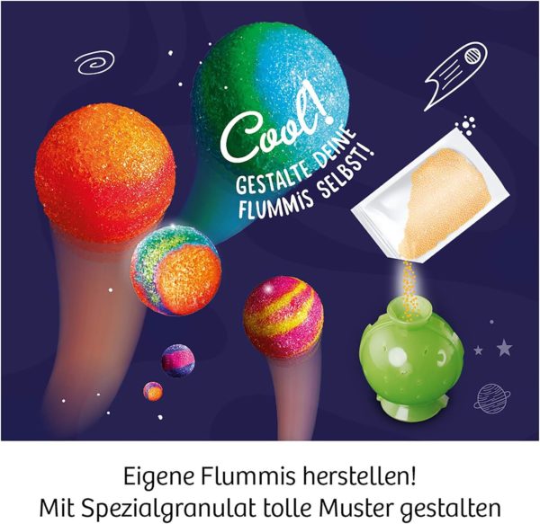 - Einfach die speziellen Farbgranulate in den Planetenformen mischen oder schichten und ins Wasser stellen. Schon nach wenigen Minuten sind die fantastisch gemusterten Springbälle fertig!