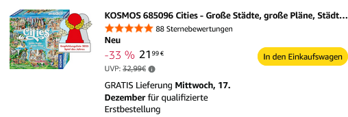 Bei Amazon gibt es das KOSMOS Cities Brettspiel für 21,99€. (Vergleichspreis: ~26€) Ersparnis: ~4€
