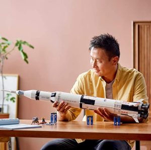 - Enthält ein meterhohes Modell (ungefähr im Maßstab 1:110) der NASA Apollo Saturn V Die abtrennbare erste Raketenstufe „S-IC“ verfügt über ein detailgetreu nachgebildetes Haupttriebwerk