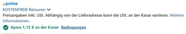 TIPP | Als PRIME-Mitglied von Amazon erhaltet ihr den Versand für einen Großteil des Sortiments bereits ohne das Erreichen von 39€ GRATIS! Amazon PRIME könnt ihr (HIER) 30 Tage (bzw. als Student oder Auszubildender 6 Monate) lang absolut kostenlos testen. Im Anschluss an den kostenlosen Testzeitraum kostet Amazon PRIME 89,90€/Jahr, bzw. 8,99€/Monat). Studenten, Auszubildende, rundfunkbeitragsbefreite Kunden oder Kunden mit Sozialpass (HIER) zahlen 44,90€/Jahr, bzw. 4,49€/Monat.