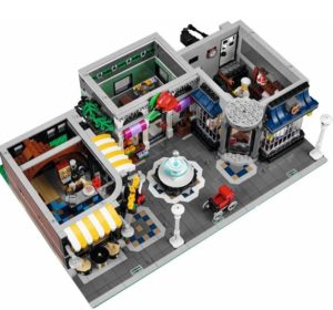 - Der dreistöckige Stadtleben verfügt über eine authentische, aufwendige Fassade mit detaillierten Fenstern und Türen, drei zusammenbaubare Ladenschilder, einen Turm, eine dekorative Dachlinie und eine Dachterrasse sowie einen detaillierten gefliesten Gehweg mit Springbrunnen, Café-Möbel im Freien. und zwei Straßenlaternen. Das detailreiche Interieur umfasst eine Bäckerei, einen Blumenladen, ein Café, ein Musikgeschäft, ein Fotostudio, eine Zahnarztpraxis, eine Wohnung und ein Tanzstudio.