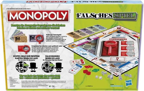 - MONOPOLY MIT EINER LUSTIGEN WENDUNG: Monopoly Falsches Spiel kommt zwar mit dem klassischen Spielablauf, aber mit einer besonderen Wendung im Spiel! Mit Monopolys Decoder können die Spieler Fälschungen entdecken