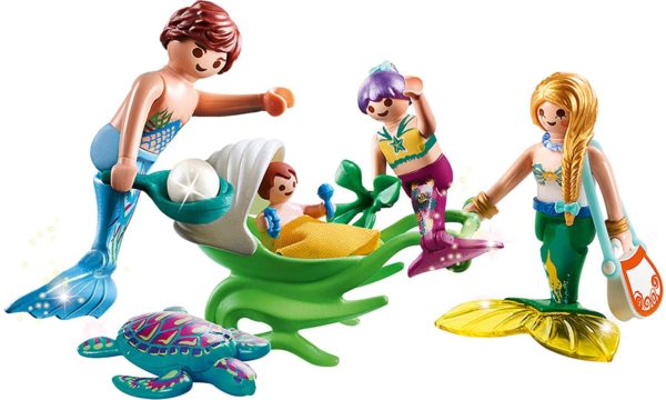 - Inhalt/Ausstattung: 1 Meerjungfrau, 1 Meermann, 1 Meermädchen, 1 MeerbabyTiere: 1 Meeresschildkröte, 1 Muschelkinderwagen, 1 Decke, 1 Perle, 1 Algenblatt mit Griff, 2 Armreifen, 2 Haarschleifen, 1 Halskette, 1 Set Babyspielzeug (2-teilig), 1 Handtasche, 1 Meereskraut