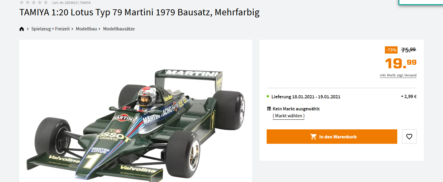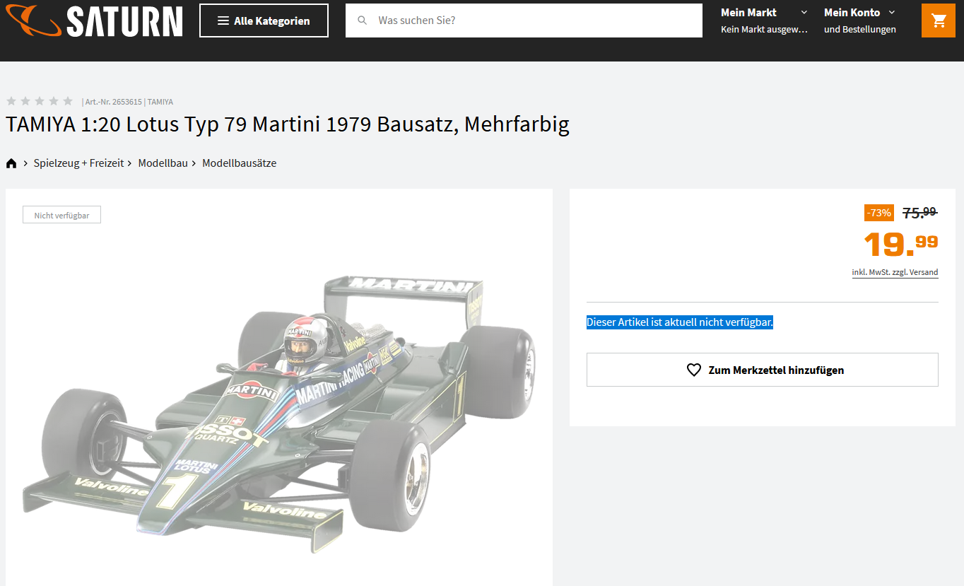 Bei Saturn bekommt man den Tamiya Martini Lotus type 79 Bausatz (20061) für 19,99€ (Vergleichspreis: ~40€) Ersparnis ~20€