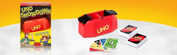 - UNO Showdown erleben – das allseits beliebte UNO mit zusätzlichen Überraschungsangriffen aus dem Showdown Gerät