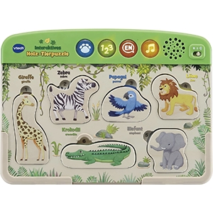 - So viele Tiere zu entdecken: Mit dem interaktiven Holzpuzzle lernt das Kind Tiere, ihre Lebensräume, Farben, Zahlen und erste englische Wörter kennen – der Musikmodus sorgt dabei für extra Spaß