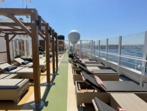 - Die weitläufigen Außendecks mit zwei Swimmingpools, mehreren Whirlpools sowie einem Wasserpark mit Wasserrutschen laden zum Entspannen ein und sorgen für die nötige Action an Bord. Erholung bietet zudem der Cloud 9 Spa mit mehreren Wellnessbereichen – von Massageräumen über Saunen bis hin zu wohltuenden Bädern – und einem umfangreichen Behandlungsangebot