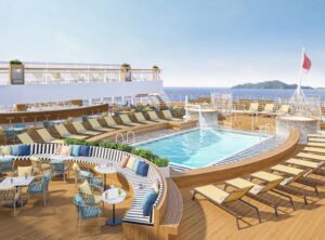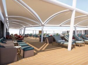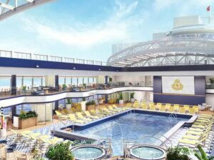 - Ein weiteres Highlight ist eine wahre Oase: Über zwei Decks erstreckt sich The Pavilion mit Glaskuppeldach, welches sich je nach Wetterlage öffnen oder schließen lässt. Gäste können hier ruhige Stunden am Pool verbringen, es sich auf Liegestühlen und anderen Sitzplätzen bequem machen und Erfrischungen zu sich nehmen. Ein großer LED-Bildschirm und eine zentrale Bühne ermöglichen Kino- und Theatervorführungen, Live-Musik sowie andere Unterhaltungsangebote. Abends genießen die Reisenden hier eine große Auswahl an gastronomischen Angeboten.