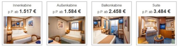 Die Emerald Princess bietet auch eine Vielzahl von Kabinen und Suiten, die den Gästen einen komfortablen Aufenthalt garantieren. Von Innenkabinen bis zu luxuriösen Suiten mit Balkon oder privatem Whirlpool ist für jeden Bedarf und jedes Budget etwas dabei.