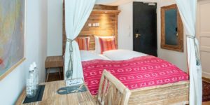 - in Ihrem Doppelzimmer mit großen Altbaufenstern und massiven Holzböden schlafen Sie in einem Himmelbett, im Badezimmer erwarten Sie gemusterte Fliesen und eine Regendusche