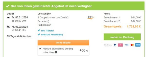 - Reisezeitraum: beispielsweise 05.01.2024 – 09.02.2024