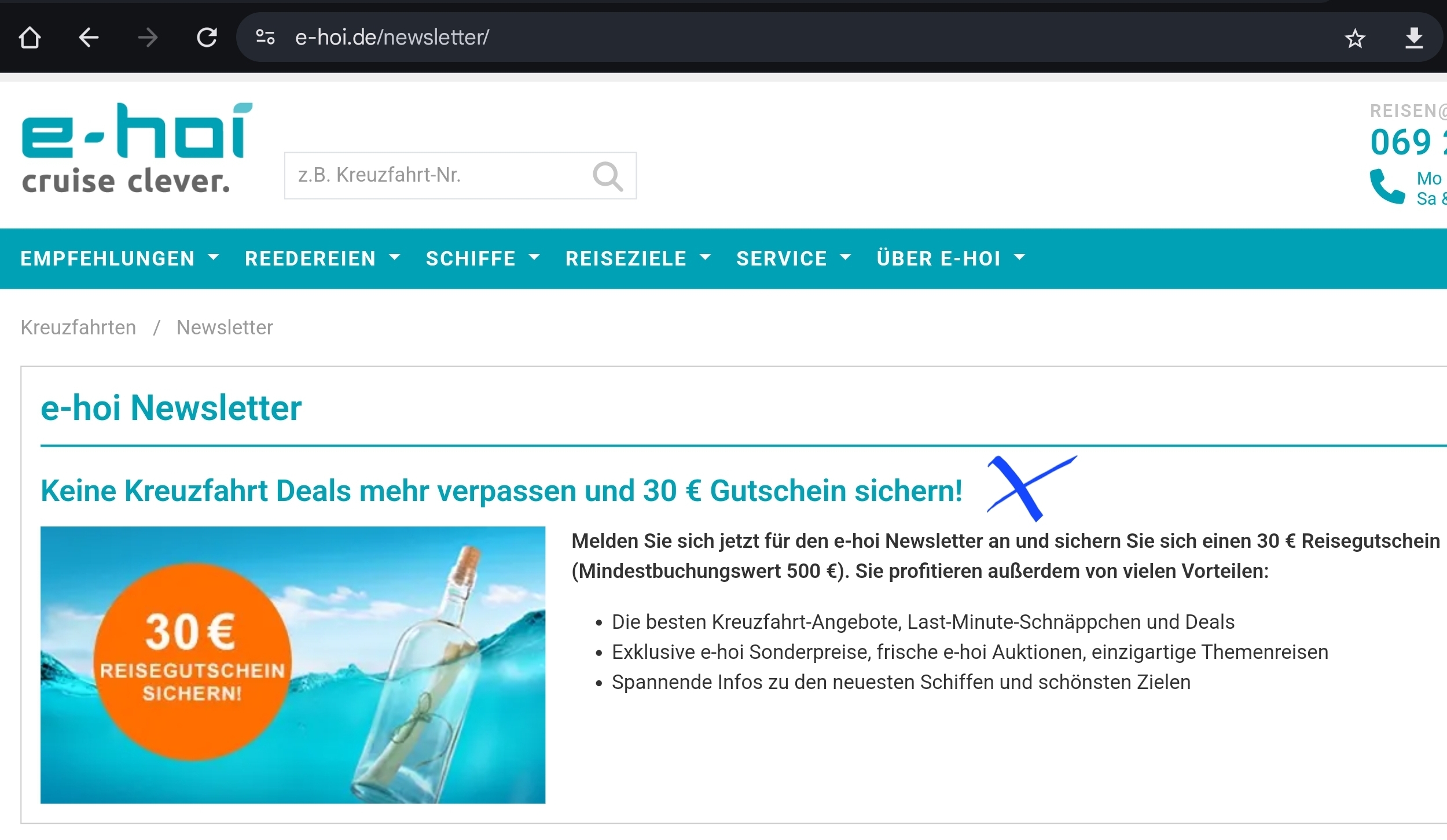 ab 500€ Reisepreis kann man noch den 30€ Gutschein für den Newsletter nutzen.