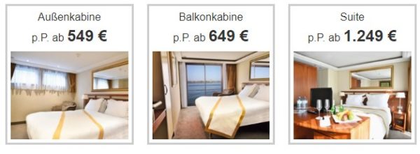 - In 75 geräumigen Außenkabinen und Suiten, verteilt auf drei Kabinendecks, genießen Schiffsreisende einen komfortablen Aufenthalt. An Bord gibt es sowohl Doppel- als auch Einzelkabinen. Alle Kabinen sind geschmackvoll eingerichtet und verfügen auf dem Violin- und Cellodeck über französische Balkone sowie auf dem Pianodeck über nicht zu öffnende Oberfenster. Die Ausstattung umfasst unter anderem bequeme Betten, eine Sitzecke, ein Badezimmer mit Dusche und WC, einen Föhn, einen Flachbildfernseher, eine Klimaanlage, ein Telefon und einen Safe. Suiten verfügen zudem über eine Badewanne.