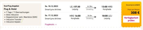Der Abflug bei meiner Testbuchung ist Leipzig. Ihr erhaltet 7 Tage All-Inclusive mit Flug ab 308€.
