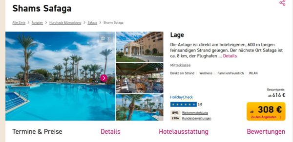 Ihr bekommt dort z.B. 7 Tage Ägypten (All inklusive) ab 308€ p. P.