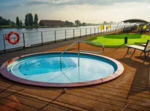 - Für entspannte Stunden an der frischen Luft eignet sich das Sonnendeck mit Liegenstühlen und einem kleinen Pool. Es bieten sich traumhafte Ausblicke auf die vorbeiziehenden Landschaften und auf das Wasser. Der Panorama-Salon und die VISIONbar laden zum Verweilen ein. Ob alleine, als Paar oder unter Freunden – hier befindet man sich stets in bester Gesellschaft. Ruhe und Erholung bietet zudem der Wellnessbereich mit Dampfbad und Sauna. Auch sportbegeisterte Reisende haben hier die Möglichkeit im Fitness-Bereich an Kardiogeräten zu trainieren und sich fit zu halten. Wer sich lieber mit einem guten Buch zurückzieht, ist in der Bibliothek genau richtig. Außerdem gibt es einen Bordshop auf dem Mitteldeck, wo Souvenirs und Mitbringsel erworben werden können.