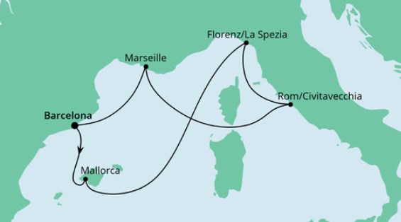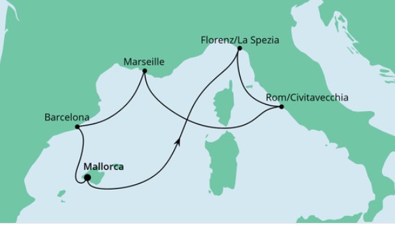- z. B. 7 Tage – westliches Mittelmeer Mediterrane Schätze ab Mallorca inklusive 100€ Boardguthaben ab 699€ p.P.