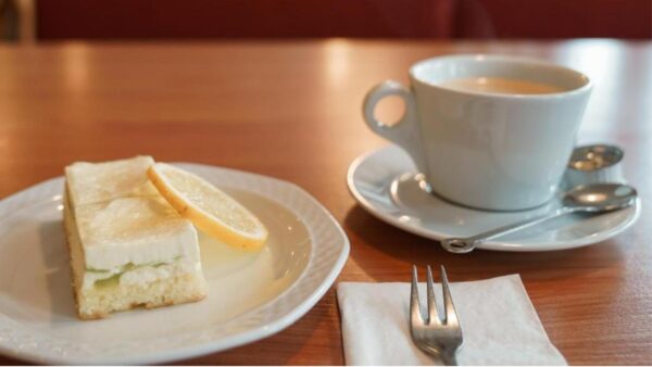 - Kaffeekränzchen mit einem Stück Kuchen und einer Tasse Filterkaffee