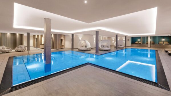 - Ein großes Hallenbad mit Unterwasser-Massagebänken und Whirl-Liegen