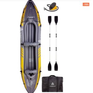 - Aufblasbares Kajak-Set für 2 Personen; mit Doppelpumpe, 3-teiligen Aluminium-Paddeln, Reparaturset und Rucksack; enthält Bungee-Seil, aufgerollte Leine und Befestigungsschlaufe; Maße: ca. 3,5 m x 78 cm.