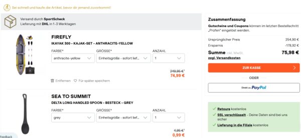 Legt dazu das Kayak und ein Zusatzartikel um über den MBW von 75€ zu kommen (z.B. den Löffel für 1€) und nutzt dann den Gutscheincode: SUNNY25