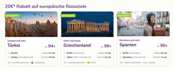 - Rabatt: 20€ auf Rückflüge innerhalb der EU (außer Türkei)