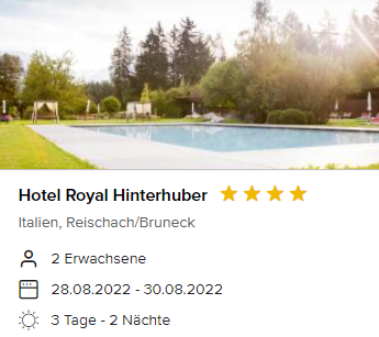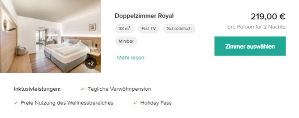 Denn über Travelcircus landet man im Hotel Royal Hinterhuber (2 Erwachsene, 2 Übernachtungen) ab 185€/pro Person.