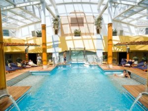 - Das Schiff hat auch einen Wellnessbereich mit einem Fitnesscenter, einem Spa und einem Pool