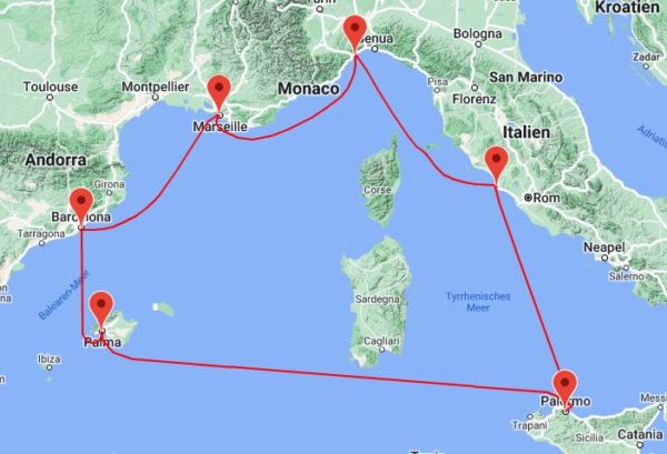 Die Reise führt euch u.a. nach Marseille, Barcelona, Palma uvm.