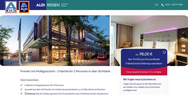 Der Deal der Woche: Der Premier Inn Multigutschein von Premier Inn, angeboten über ALDI Reisen in Kooperation mit Animod GmbH, sorgt für eine flexible Auszeit zum kleinen Preis – perfekt für Kurzentschlossene oder spontane Wochenenden!