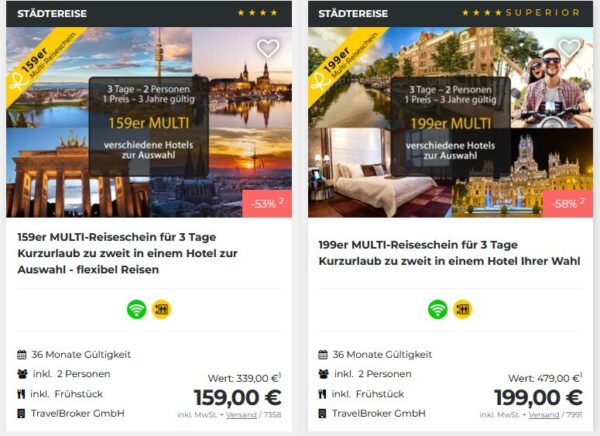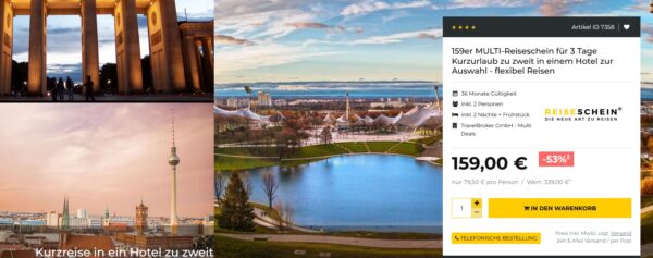 Ihr erhaltet nun Reiseschein MULTI-Reiseschein / Hotelgutscheine für 2 Übernachtungen mit Frühstück für 2 Personen recht günstig und da der Bestellwert über 100€ liegt, gibt es nochmal 10€ Rabatt!
