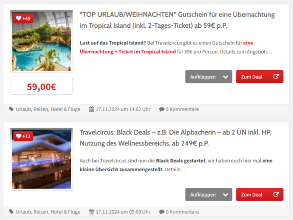 Travelcircus hat immer wieder sehr gute Angebote (Link) Wir berichten fast jede Woche über diese. Alleine die letzten 3 Monate haben wir fast 30 Deals geschrieben. 🙂