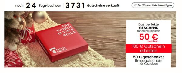 Bei Travelcirus bekommt ihr einen 100€ Travelcircus Gutschein für 50€.