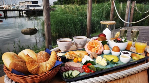 - Im Hafenrestaurant mit Terrasse können Sie den traumhaften Blick auf den See genießen und sich dabei das Frühstück von 08:00 – 11:00 Uhr sowie die hauseigenen Spezialitäten – von klassischen Burgern bis hin zu inseltypischen Käsesorten – ab 11:00 Uhr schmecken lassen. Für den Kaffee und das Stück Kuchen am Nachmittag können Sie sich ein lauschiges Plätzchen in einem der vielen verträumten Gartencafés suchen