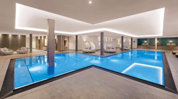 - Ein großes Hallenbad mit Unterwasser-Massagebänken und Whirl-Liegen