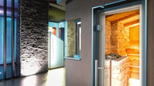 - Eine Bio-Sauna mit Farblicht Therapie (60 °C)