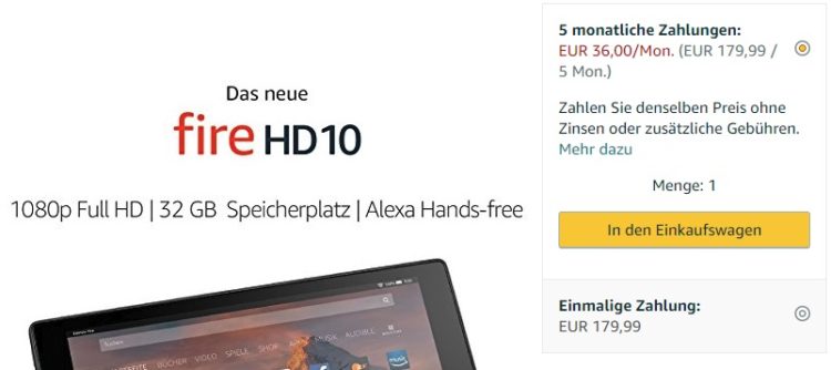 Unabhängig von Produkt und Zahlungsbetrag sind immer fünf Raten fällig. Ist der Preis nicht sauber durch fünf teilbar, fällt die letzte Rate entsprechend kleiner aus. Die einzelnen Raten sind zu folgenden Terminen fällig (Beispiel: Fire HD 10 Tablet):