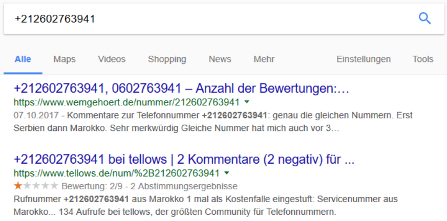 Besonders erfolgreich können solche Betrugsanrufe vor allem in Nordrhein-Westfalen sein. Denn die Ländervorwahl der Staaten ähnelt oft den mit 02 oder 03 beginnenden Ortsvorwahlen im genannten Bundesland. Beispiel: Serbiens Vorwahl lautet +381 und Tunesiens Vorwahl +216. Das kann in einer hektischen oder unachtsamen Situation gerne mal teuer werden. Deshalb solltet ihr im Zweifelsfall die Rufnummer über Google prüfen lassen. Dazu reicht es, wenn ihr die genannte Rufnummer einfach in das Suchfeld eingebt.