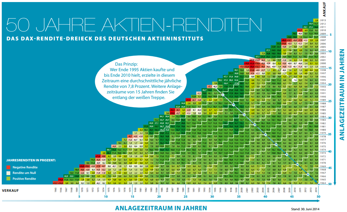 Natürlich kannst du auch kurzfristig (wenige Monate/Jahre) in ETFs investieren, das Risiko ist dann aber deutlich höher, denn während es über Jahrzehnte an der Börse im Durchschnitt jährlich mit einer traumhaften Rendite aufwärts ging (von der jedes Tages- oder Festgeldkonto nur träumen kann), so gab es natürlich auch immer wieder ein paar wenige negative Renditejahre – siehe dazu nochmal das Renditedreieck des DAX aus unserer ersten Folge. Solltest du also heute ETFs kaufenb und nur ein Jahr halten wollen und morgen setzt die neue Finanzkrise ein, dann musst du entweder einen langen Atem beweisen und doch länger halten, bis wieder positive Rendite an den Börsen erwirtschaftet werden kann – oder du realisierst einen Verlust).