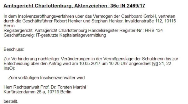 In der öffentlichen Bekanntmachung der Insolvenzeröffnung des Amtsgerichts Berlin Charlottenburg heißt es: „Zur Verhinderung nachteiliger Veränderungen in der Vermögenslage der Schuldnerin bis zur Entscheidung über den Antrag wird am 10.5.2017 um 10:20 Uhr angeordnet (§§21, 22, InsO); Zum vorläufigen Insolvenzverwalter wird Herr Rechtsanwalt Prof. Dr. Torsten Martini (…) bestellt“. Das bedeutet, dass nur noch der Insolvenzverwalter über die Verfügung der Bankkonten oder Außenstände des Unternehmens entscheiden darf.