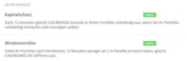 Die von CASHBOARD zusätzlich erbrachten Leistungen des Kapitalschutzes und der Mindestrendite laufen mit der Geschäftsaufgabe aus. Bis dato erhaltene Zahlungen und Renditen werden jedoch nicht zurückgefordert und verbleiben auf den Kundenkonten. Auf Grund der langfristig, aber auch jüngsten ausgesprochen positiven Renditeentwicklung der Portfolios steht der Großteil der Kunden zum Teil deutlich im Plus bzw. über der Mindestrendite. Für weitere Informationen beachten Sie bitte die Hinweise zur Mindestrendite, Kapitalschutz sowie andere Leistungen von CASHBOARD im Abschnitt „Hinweise zu Mindestrendite und Kapitalschutz„.