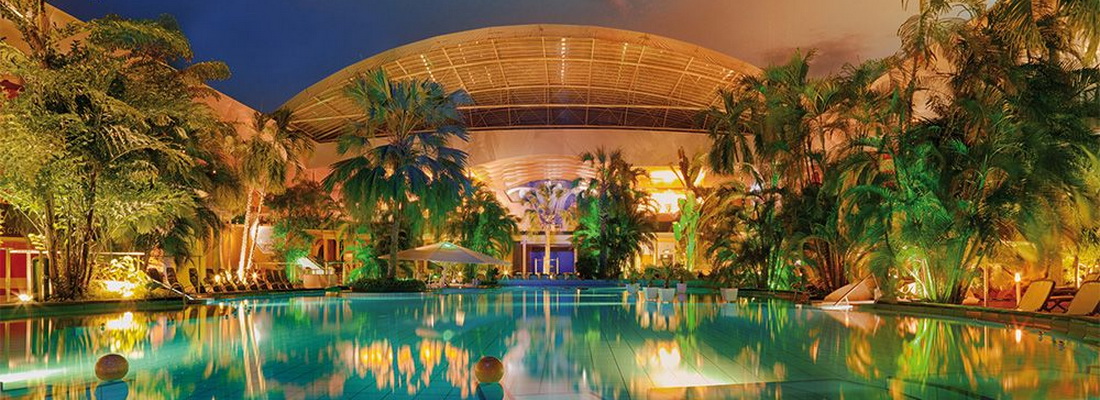 Herzstück der imposanten Anlage ist das von Palmen umgebene Thermalbecken. Ein Europa einmalig ist die riesige sich öffnende Glaskuppel, welche das riesige Becken überspannt. Wird sie geöffnet, verwandelt sich die Anlage in eine wundervolle Freilufttherme. Nach Zahlung eines kleinen Aufpreises ist das Wechseln vom Thermen-Paradies in das Sauna-Paradies oder in die VitalOase möglich.