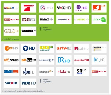 In dieser Grafik seht ihr die HD-Programme ab 29.03. (HD) und unten die frei empfangbaren, teils regionalen öffentlich rechtlichen Sender: